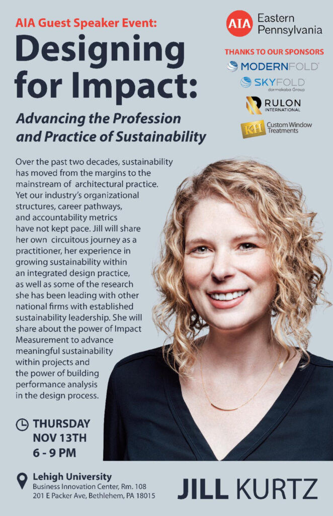 Join AIA Eastern Pennsylvania for an engaging guest speaker event with Jill Kurtz, AIA, Principal and Director of Sustainable Design at Page, now Stantec. In her talk, Designing for Impact: Advancing the Profession and Practice of Sustainability, Jill will share insights from her 20-year career advancing sustainability within architecture—highlighting how impact measurement and building performance analysis can transform ideals into measurable results.